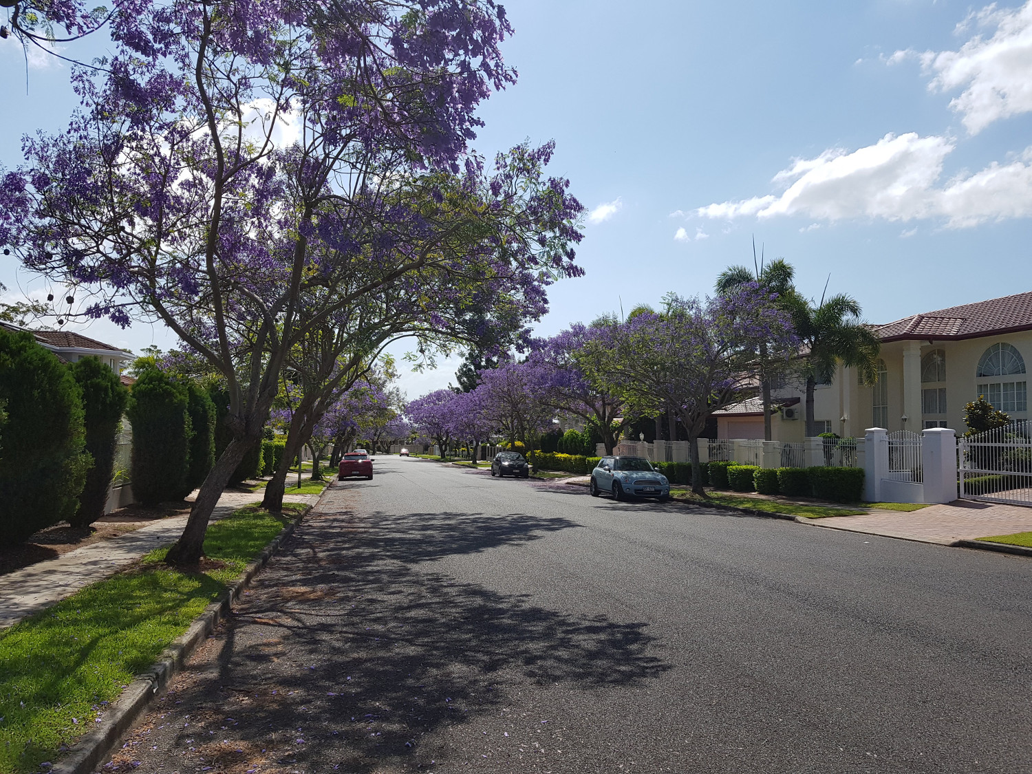 Now is Jacaranda Flowers Blooming Season in Brisbane. As I mentioned before, you can go to UQ or New Farm Park, even go to Grafton, there is a Jacaranda Festival. However, in Brisbane, that is easy, if you drive around your local area, you can find some streets will have a lot of Jacaranda tree. This weekend, we went to a local side street in Sunnybank Hills. I found the whole street has Jacaranda planted in both sides. That looks great. That is a Purple Rain! I love it!